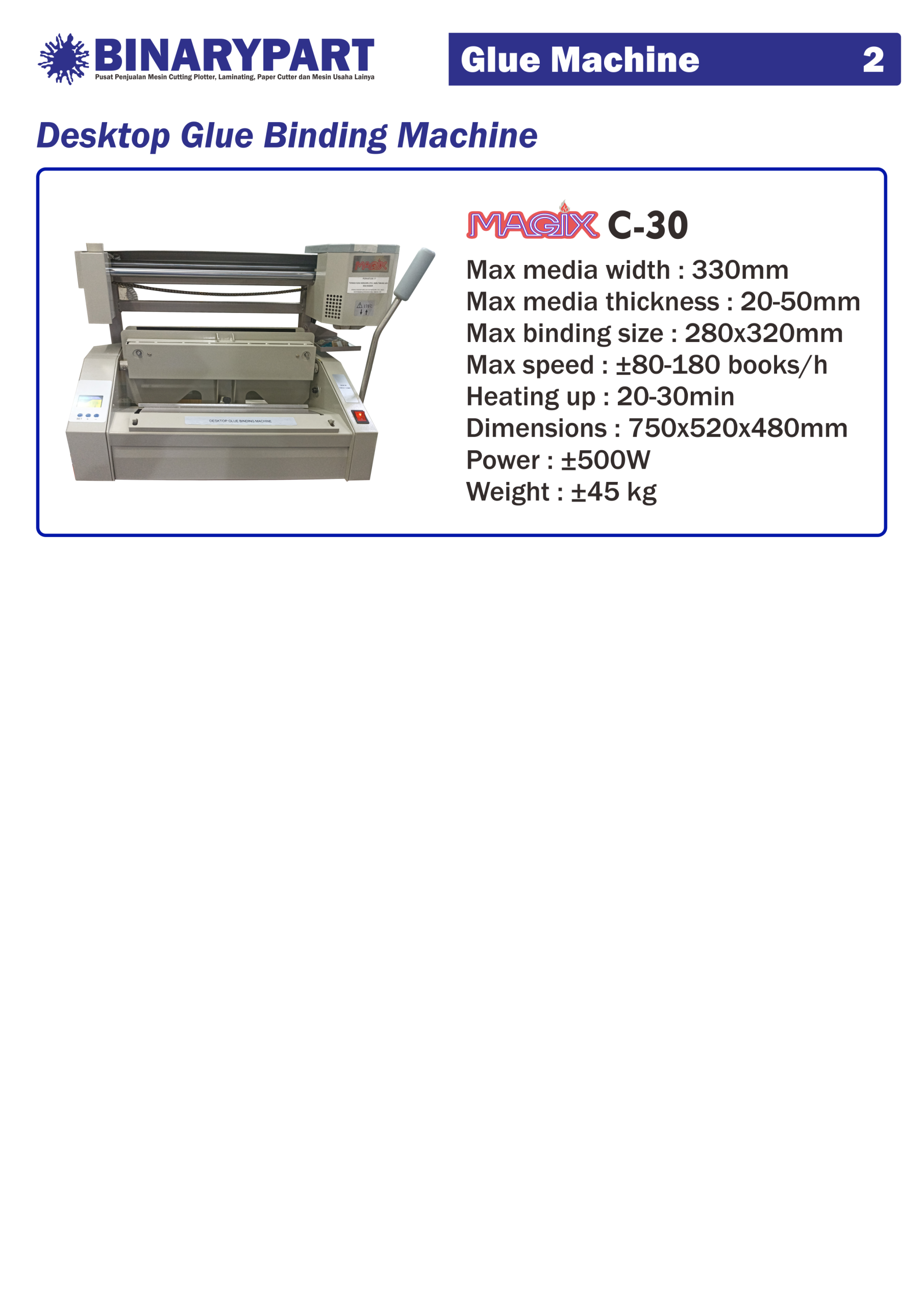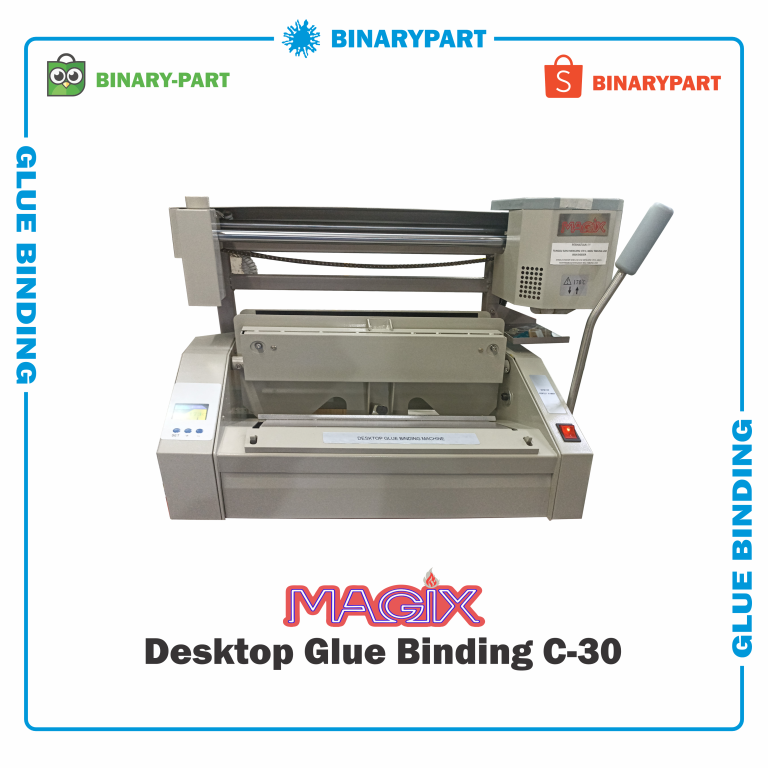 Magix Gluing Binding C-30 atau jilid buku lem panas yang bisa digunakan untuk menjilid buku hingga ukuran 33 cm (F4). Mesin dengan tampilan modern yang dibekali dengan beragam fitur penting untuk menjilid 80-180 buku/jam. Ditambah menjadi mesin yang paling hemat listrik dikelasnya.